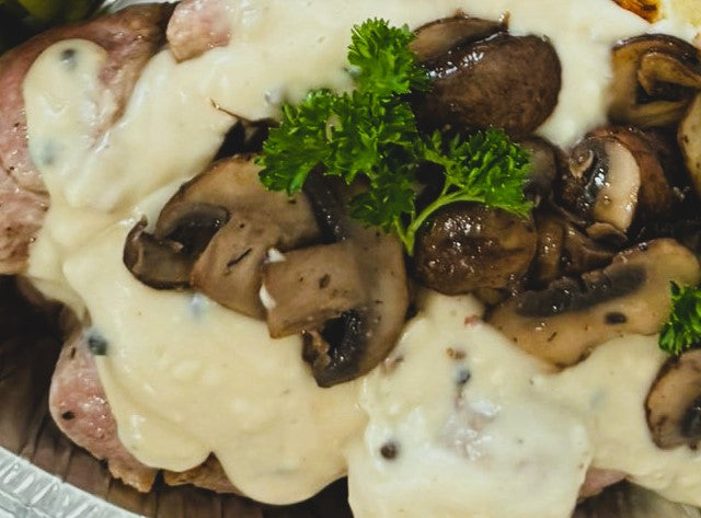 Getrancheerde varkenshaas met een romige pepersaus en champignons