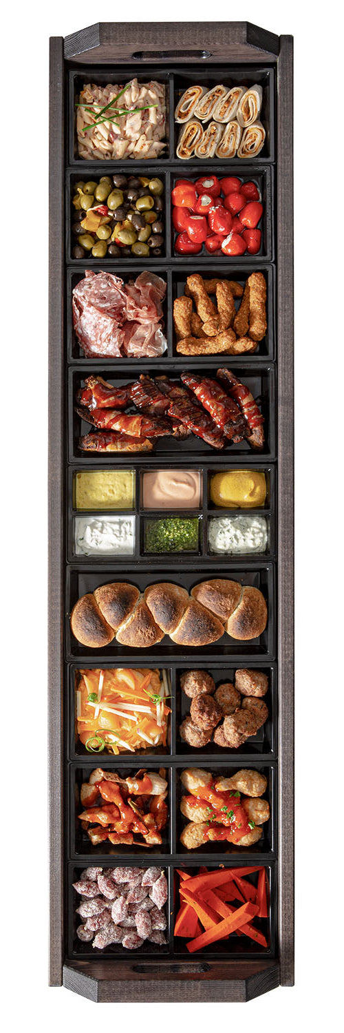 Grote houten plank gevuld met allerlei kleine hapjes (18 soorten).
